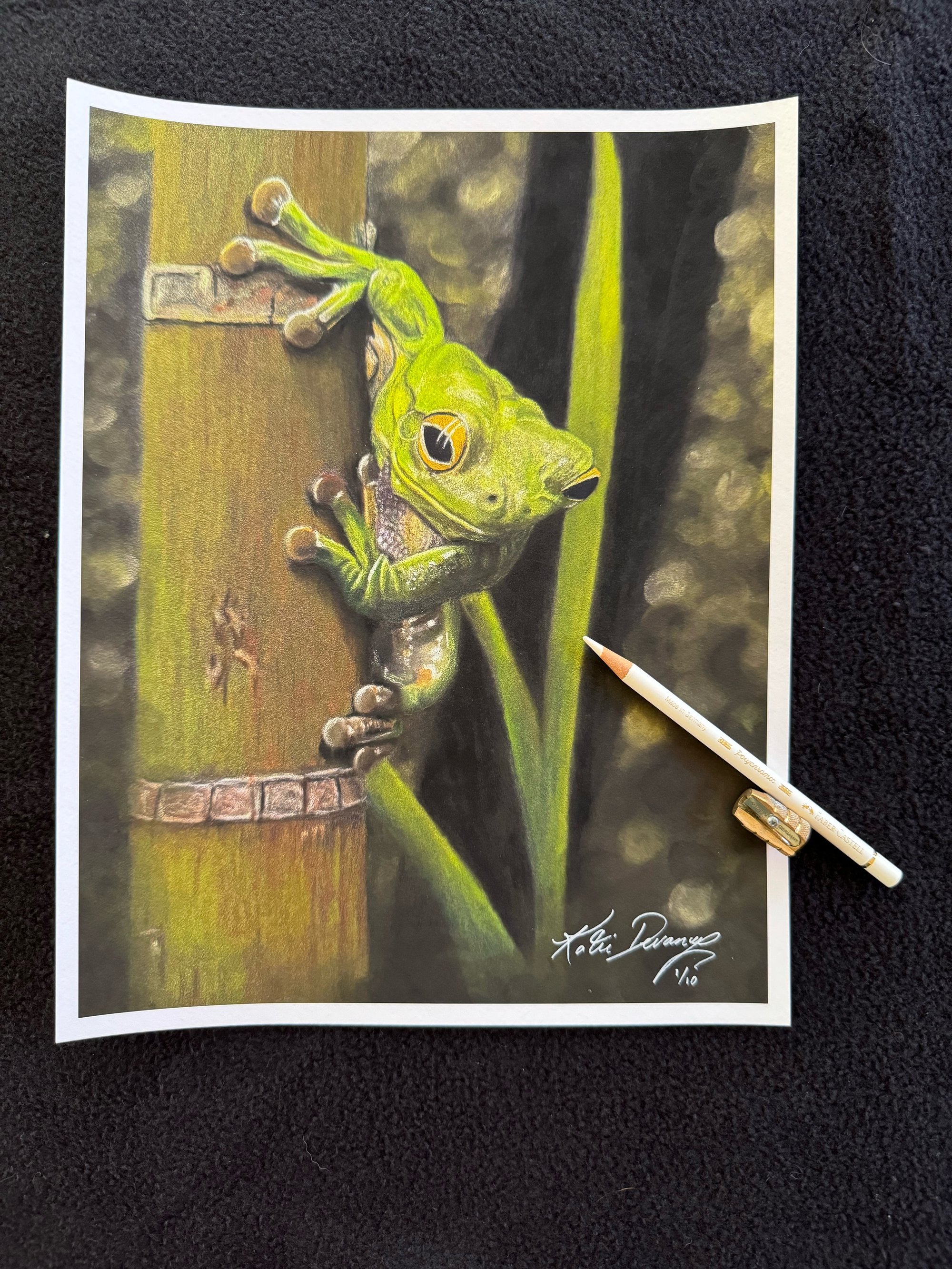 "Froggy" captures the enchanting presence of a green tree frog as it gracefully clings to a bamboo stalk. Measuring 10x13 inches, this vibrant piece is meticulously crafted using pastel pencil and PanPastel, showcasing the artist's dedication to realistic detail. The frog's bright green skin creates a striking contrast against the bamboo, drawing the viewer's eye and enhancing the overall visual appeal.